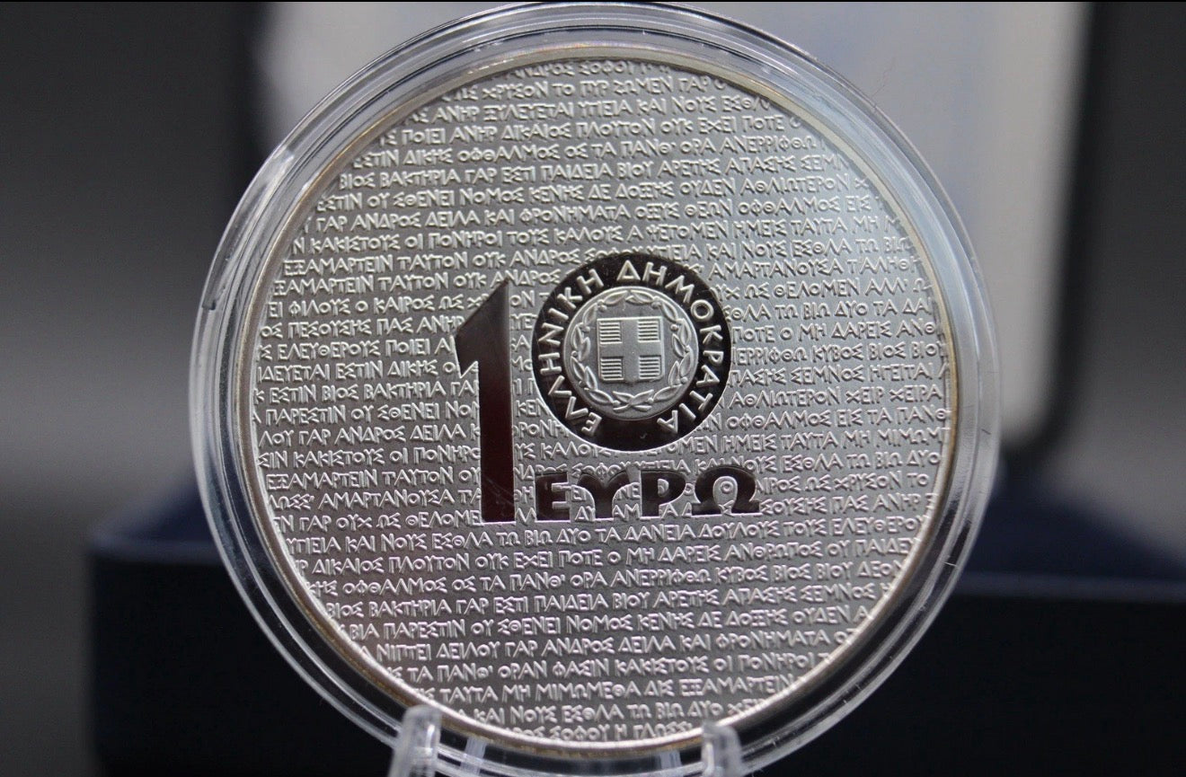 Diese hochwertige Silber-Sammlermünze Griechenlands ehrt den bedeutenden antiken Dramatiker Menander, den wichtigsten Vertreter der sogenannten Neuen Komödie im antiken Theater.