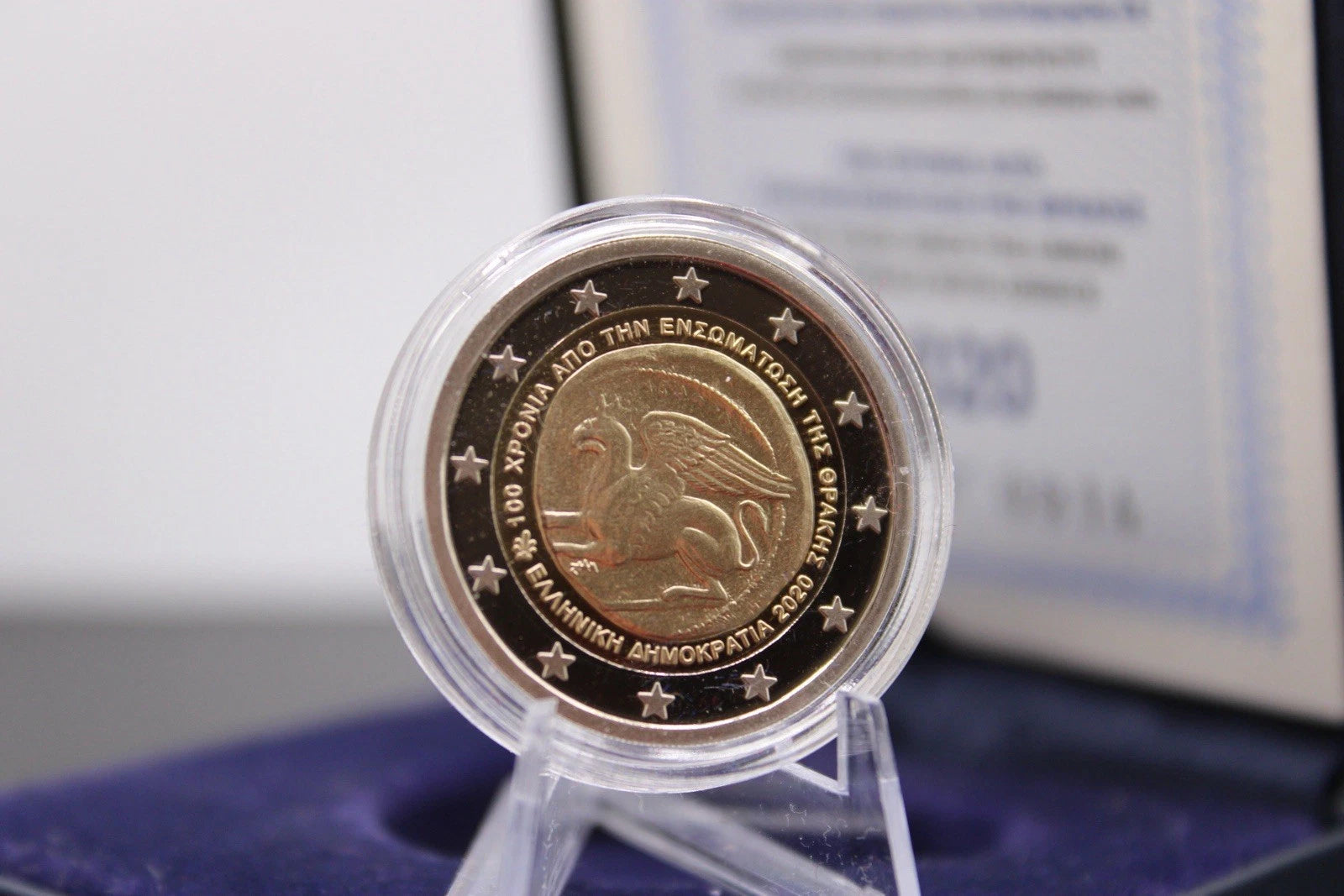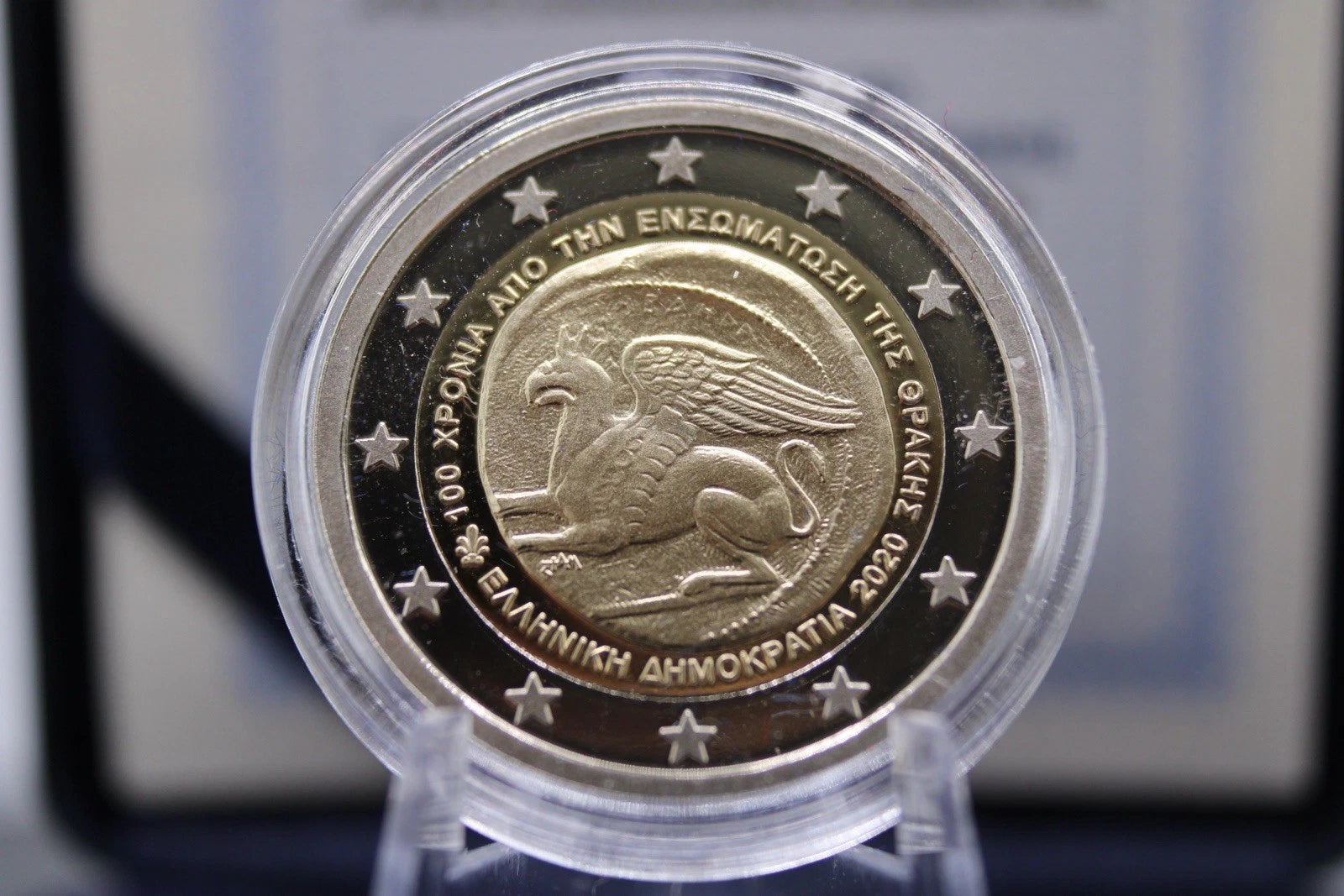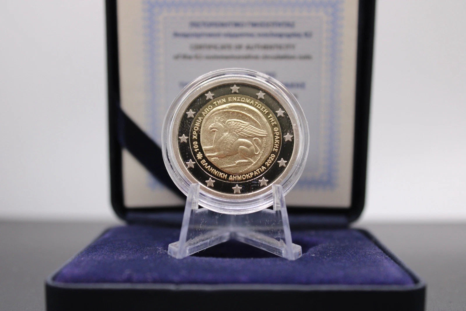 Zum 100-jährigen Jubiläum der Wiedervereinigung Thrakiens mit Griechenland gab die Bank von Griechenland im Jahr 2020 eine besondere 2€ Gedenkmünze heraus. Die hier angebotene Proof-Version gehört zu den hochwertigsten Prägungen, glänzt spiegelnd und zeigt feinste Details – ein wahres Highlight für Sammler.